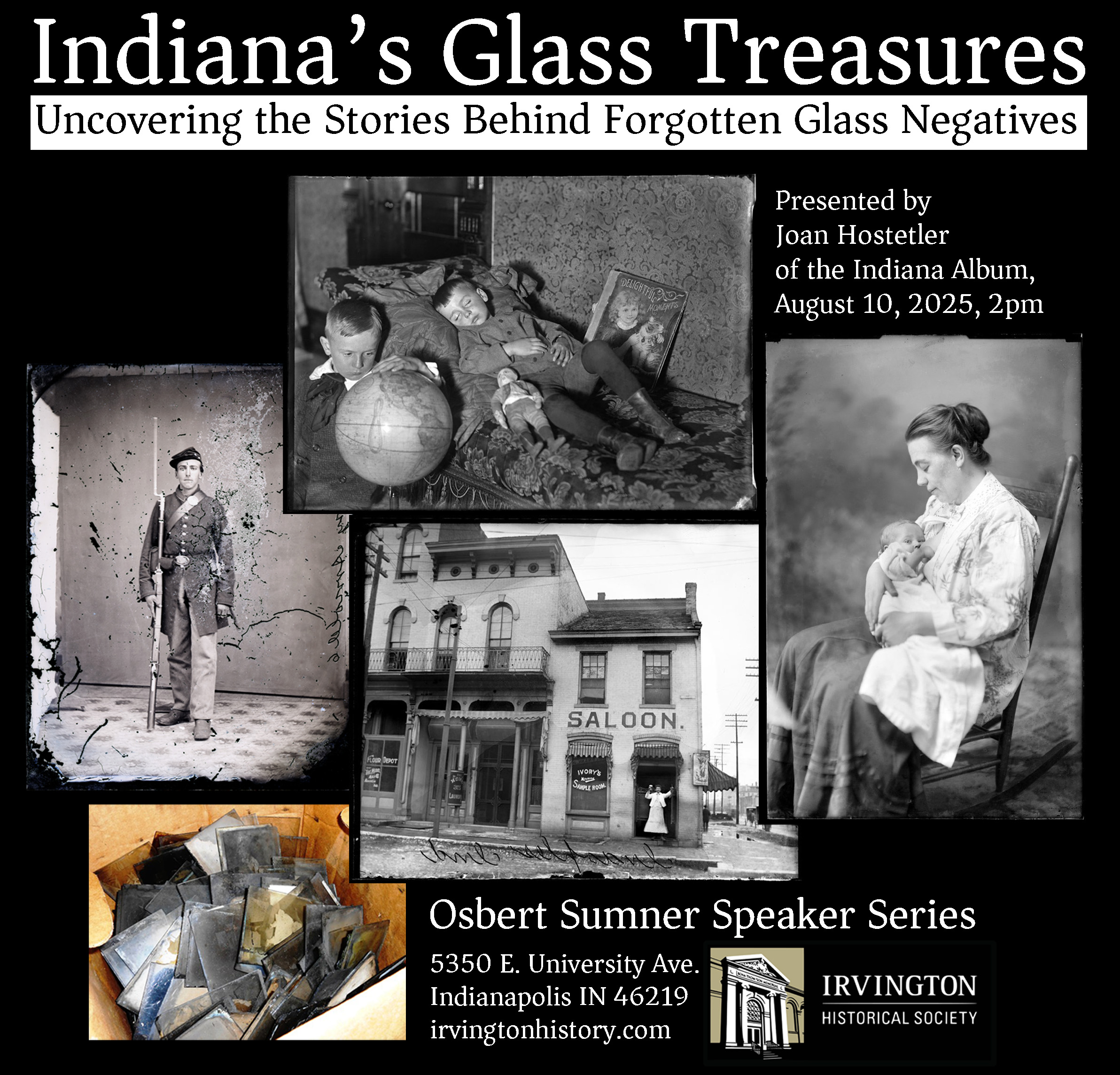 August 10, 2025, 2pm – Indiana’s Glass Treasures: Uncovering the Stories Behind Forgotten Glass Negatives presented by Joan Hostetler (The Indiana Album)